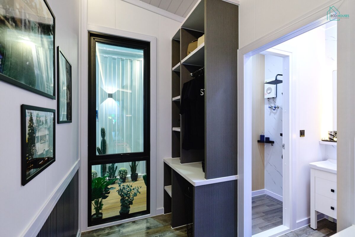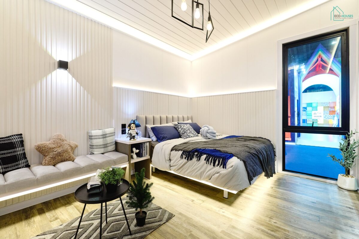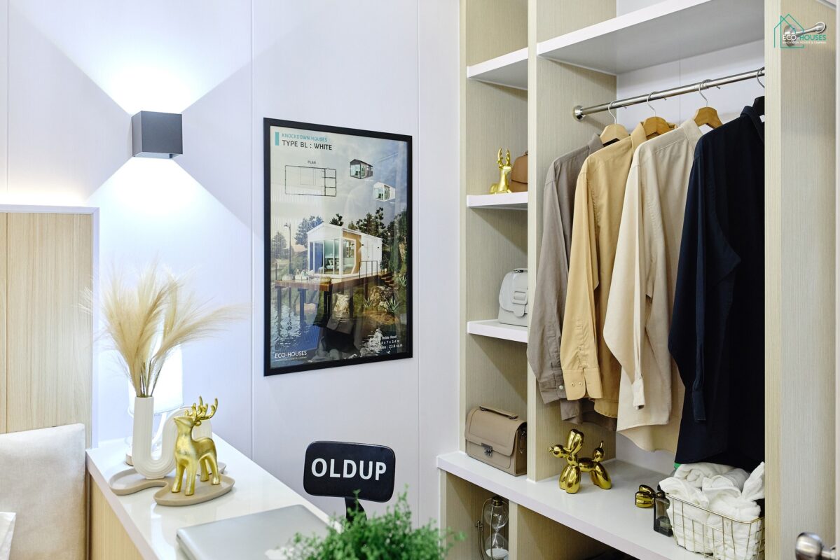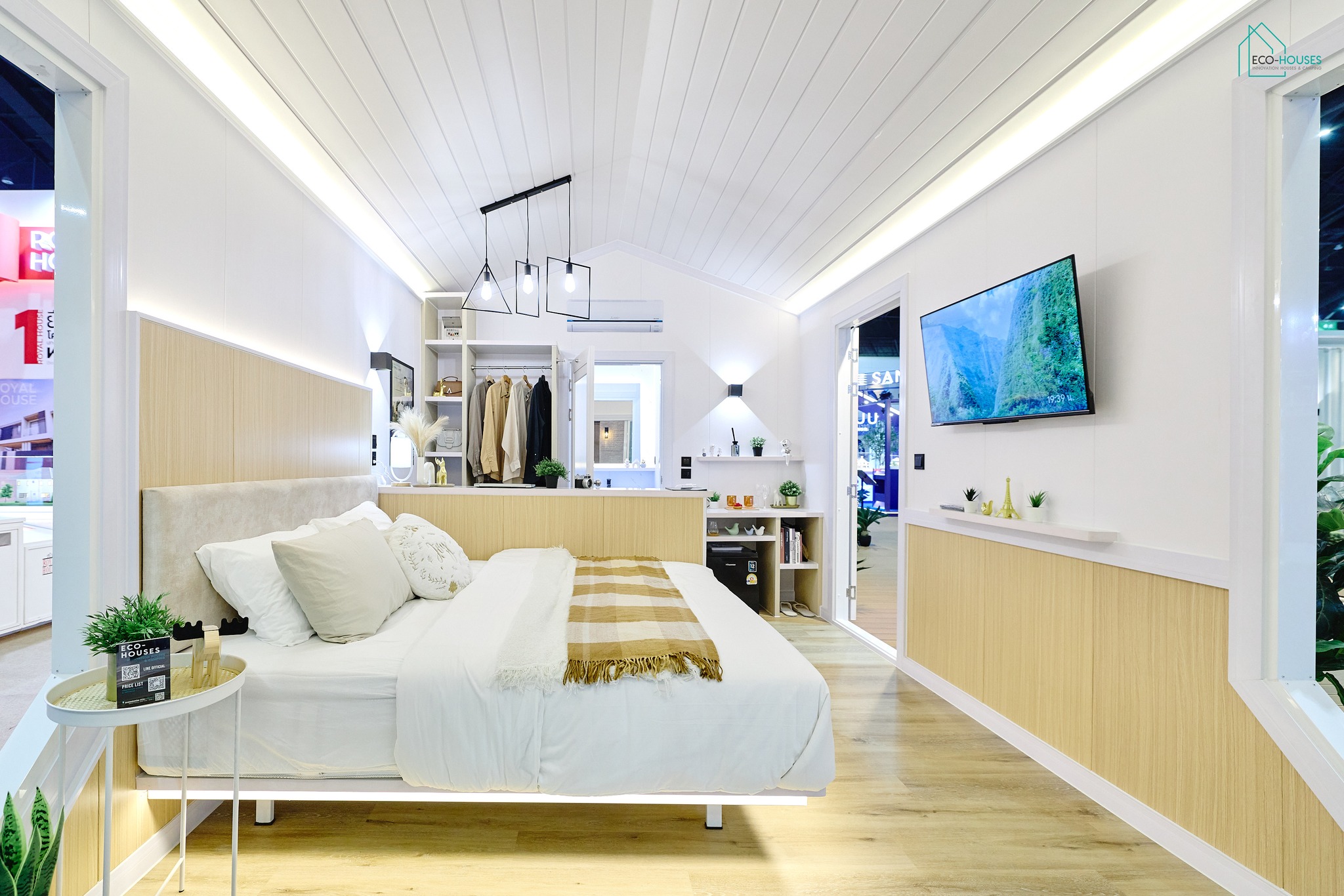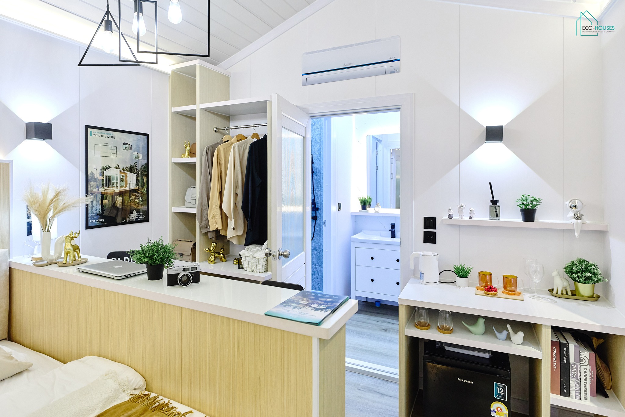 บ้านน็อคดาวน์ ขนาด 3.4 x 7 เมตร พื้นที่ใช้สอย 23.8 ตร.ม แบ่งพื้นที่ภายในได้อย่างลงตัว ตกแต่งภายในบิ้วอินทั้งหลัง เชื่อมต่อทุกฟังก์ชั่น ตอบรับชีวิตยุคใหม่